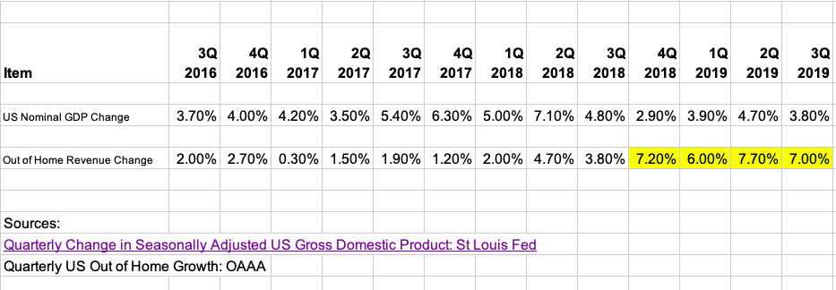 US Out of home revenues have outpaced the US economy for four straight quarters as you can see in the chart below. In the third quarter of 2019 out of home revenues grew almost twice as fast as the US economy.