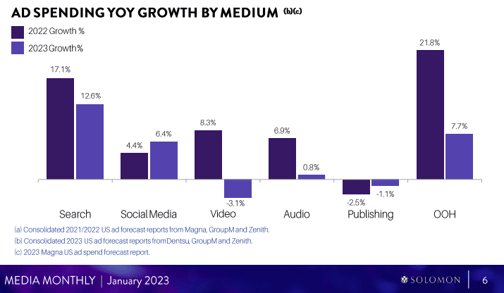Solomon Partners says “the much discussed potential recession is not currently impacting the advertising market.” In the January 2023 Media Monthly the Solomon team reviewed the ad spending estimates from GroupM, Magna and Zenith. The three forecasts predict out of home ad spending to grow 22% in 2022 and 8% in 2023. Out of home revenues grow faster than all other forms of media and only trail search spending in 2023.