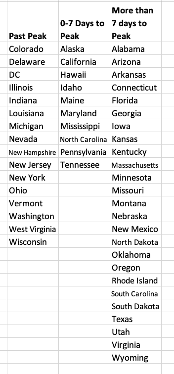 15 states and the District of Columbia are past the covid-19 hospital demand peak and are on the downward curve. Many smaller and more rural states have a week or two until the peak. Here’s a list of states which are past the peak together with a list of states which will peak in 0-7 days and in more than 7 days. You can look up your state’s curve at the Institute for Health Metrics projection page.