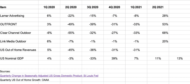 - The US public out of home companies grew faster than the US GDP in the second quarter of 2021.