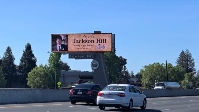 Jackson invites everyone to take advantage of this opportunity and will work with those interested to craft the perfect message. Because the boards are digital Veale can get creative and quickly produce messages with individualized information about each graduate. Please contact Tom Jackson directly to arrange this at 707-777-7777 or tom@vealeoutdoor.com.