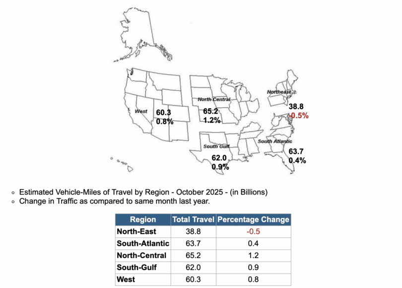 US vehicle miles traveled rose 0.6% in October 2024 according the the FHWA Traffic Volume trends report for October 2025.  Vehicle miles traveled rose 1% for the first 10 months of 2025.  As you can see from the table below miles travelled rose the most in the central and western states.