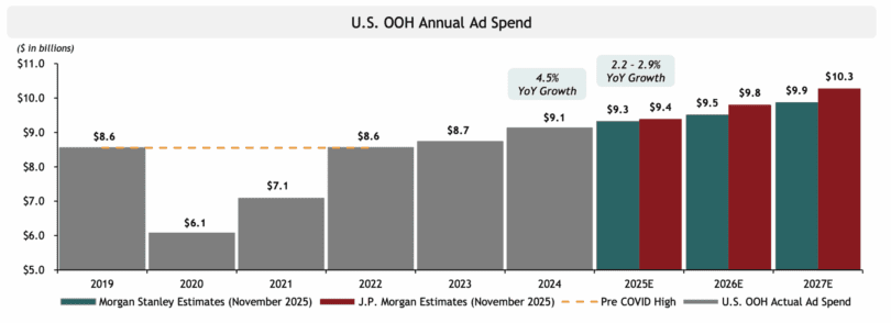 An interesting chart on the projected US out of home annual ad spend for the next two years. The chart was prepared by Moorgate Capital Partners and is contained in the Moorgate OOH Industry Q3 OOH Snapshot. Morgan Stanley and JP Morgan project US out of home annual ad spending to grow by 2-3% over the next two years down from 4.5% growth in 2024.