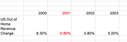 Look at out of home revenues in the years before during and after the 9/11/01 terrorist attacks. Healthy growth in 2000, slightly down in 2001, slightly up in 2002, healthy growth in 2003.