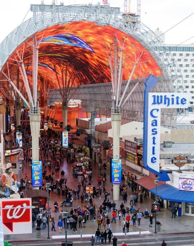 The Fremont Street Experience canopy entertains more than 20 million visitors annually. Adjacent to 10 casinos and more than 60 restaurants, the digital canopy is 1,500 feet long and is suspended 90 feet above a pedestrian mall. A light and audio show by Viva Vision plays every hour in the evening and SlotZilla operates zip lines the length of the canopy.