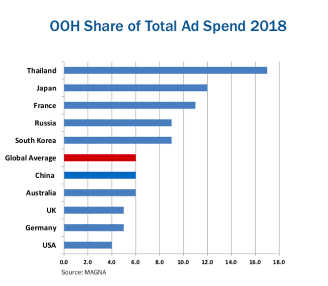 The US out of home industry did $8 billion in revenue last year which equates to 4% of the US advertising spend. Out of home advertising averages 6% of the global ad spend. See this chart from The August 12, 2019 OAAA Outlook.