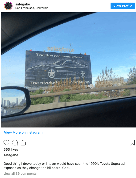 The Drive has a great article about a picture someone took of a 27 year old Toyota ad on a billboard in San Francisco. The ad was hand-painted on the sign in 1992 and rather than paint over the ad, Clear Channel has simply been stretching vinyl over the hand-painting since then When crews go out to change the vinyl drivers notice the old ad.