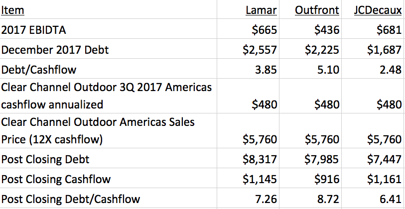 Look at the analysis below. Insider assumes a sale of Clear Channel Outdoor Americas (North and Central America) for $5.8 billion or 12 times fourth quarter Americas cashflow annualized. Clear Channel Outdoor received 12.5 times cashflow the last time it sold assets. Insider assumes with 100% debt financing. The purchase increases Debt/Cashflow for Lamar, Outfront and JCDecaux above the 6:1 level which Insider thinks is sustainable.