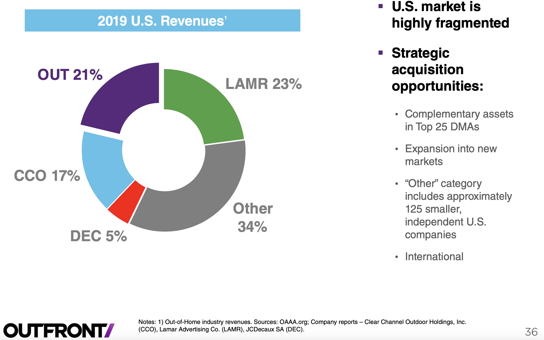 Did you know that independent out of home companies have the largest share of the US out of home market. Look at this slide from OUTFRONT Media’s December 2020 Investor Presentation. Independent operators make up 34% of 2019 US out of home revenues followed by Lamar (23%), OUTFRONT (21%), Clear Channel Outdoor (17%) and JCDecaux (5%).