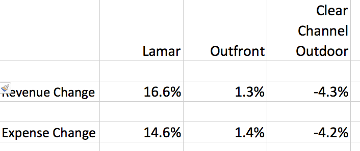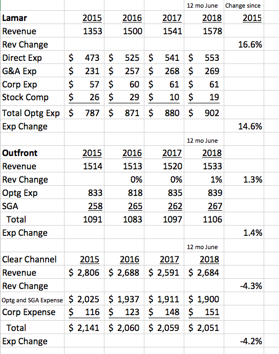 The chart summarizes the change in revenue and the change in expenses at Lamar, Outfront and Clear Channel Outdoor since 2015 to June 2018 The analysis excludes non-cash charges like depreciation and asset gains (losses) and restructuring charges although you could make the case that restructuring charges should be included in the analysis.