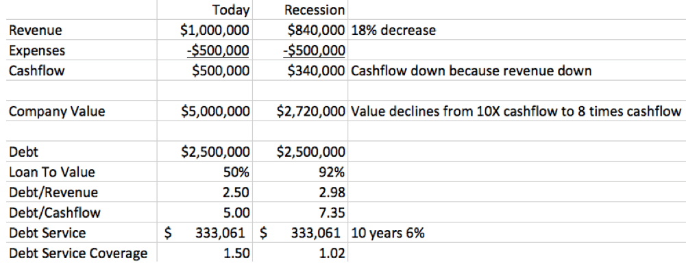 Take the example below. Your out of home company is generating $1 million of annual revenue, $500,000 of expense and $500,000 of cashflow. You borrow $2.5 million (5 times cashflow of 2.5 times revenue). Your annual debt service is $333,000. A recession occurs. Revenues decline by 18% which is what happened in 2009. Out of home investors become more conservative and multiples decline from 10X cashflow to 8X cashflow. The value of your company has shrunk from $5 million to $2.7 million but you are still solvent. The value of your company is worth more than your debt of $2.5 million. Even more importantly, your cashflow of $340,000 is sufficient to handle debt service of $333,000 without defaulting.
