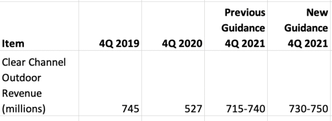 Clear Channel Outdoor stock rose 8% yesterday after the company announced it will consider selling their European business. Clear Channel Outdoor also increased fourth quarter 2021 revenue guidance. It raised fourth quarter revenue growth by 2%. Fourth quarter consolidated revenues are projected to grow 39-42% and return to pre-covid levels. See table below.