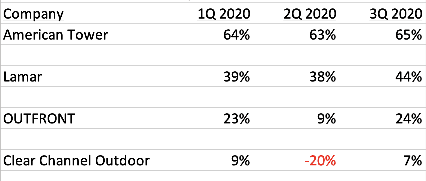 A tower company is real estate plain and simple. Leases are long term so you don’t need much of a sales staff. Leases are triple net so margins are very high. Out of home is real estate and sales and creative and data and production. Many more moving parts and a harder business to execute well. Look at how much higher American Tower’s cashflow margin compared to the cashflow margins of the Big Three out of home companies.