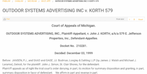 • The Michigan Court of Appeals overturned the trial court’s decision and ruled in favor of Outdoor Systems.  The court found that case law in other states had demonstrated that billboards are trade fixtures; that form and size are not determinate of whether something is a trade fixture ; and that the documentary evidence (e.g. the lease agreements) demonstrated Outdoor Systems owned the billboards.